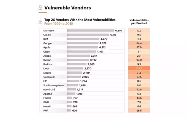 Comme on peut le voir, Microsoft (Tous systèmes Microsoft confondus) est premier dans le nombre de faille de ses systèmes sur la période de 1999 à 2019.