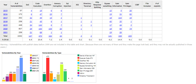 Windows 10 est disponible publiquement depuis juillet 2015, on peut donc voir que depuis sa mise en service jusqu’en 2021, un peu plus de 2200 failles ont été trouvées (et corrigées pour la plupart) or rien que pour l’année 2019, 448 failles ont été détectées et corrigées et 807 en 20201.